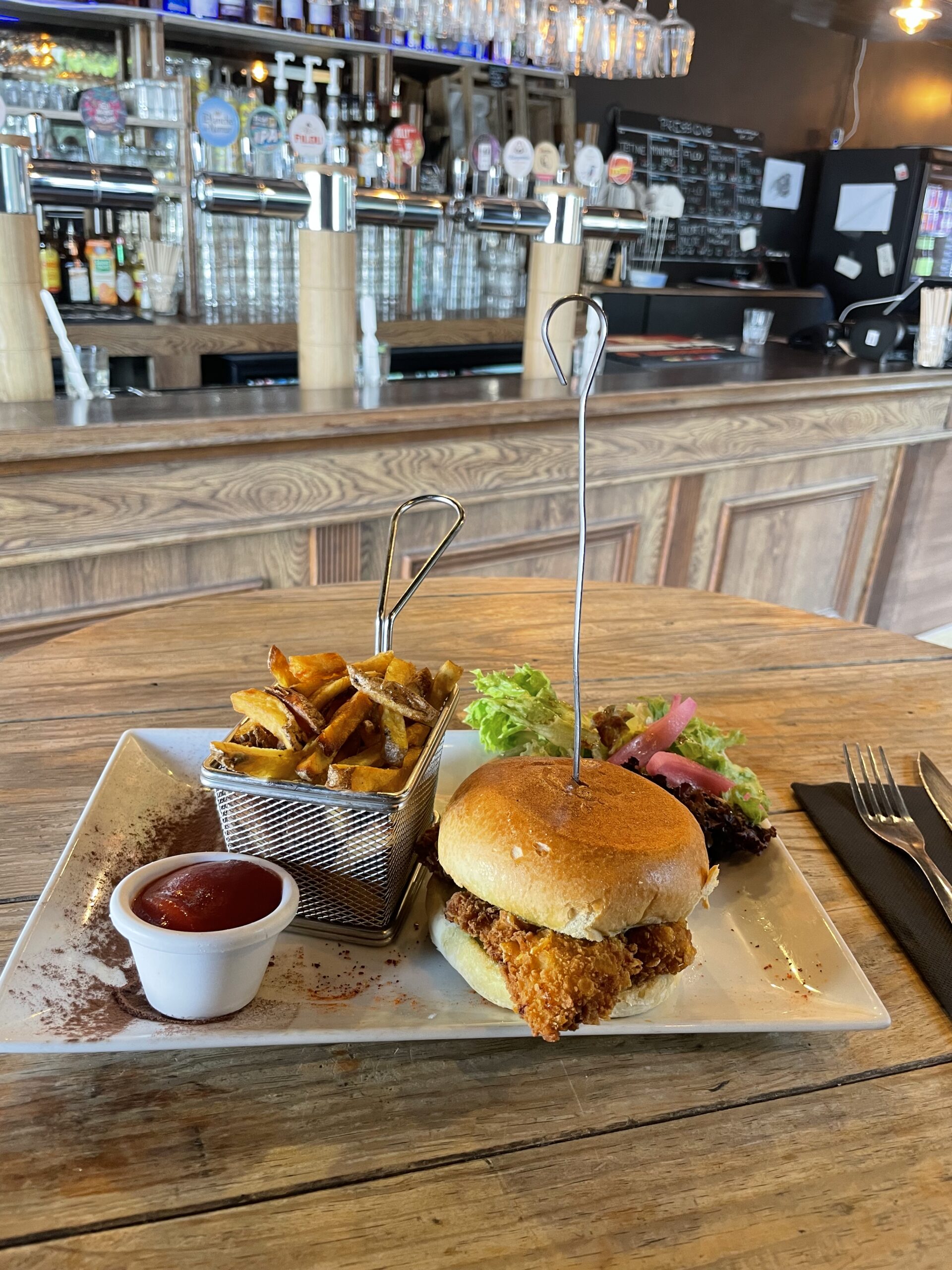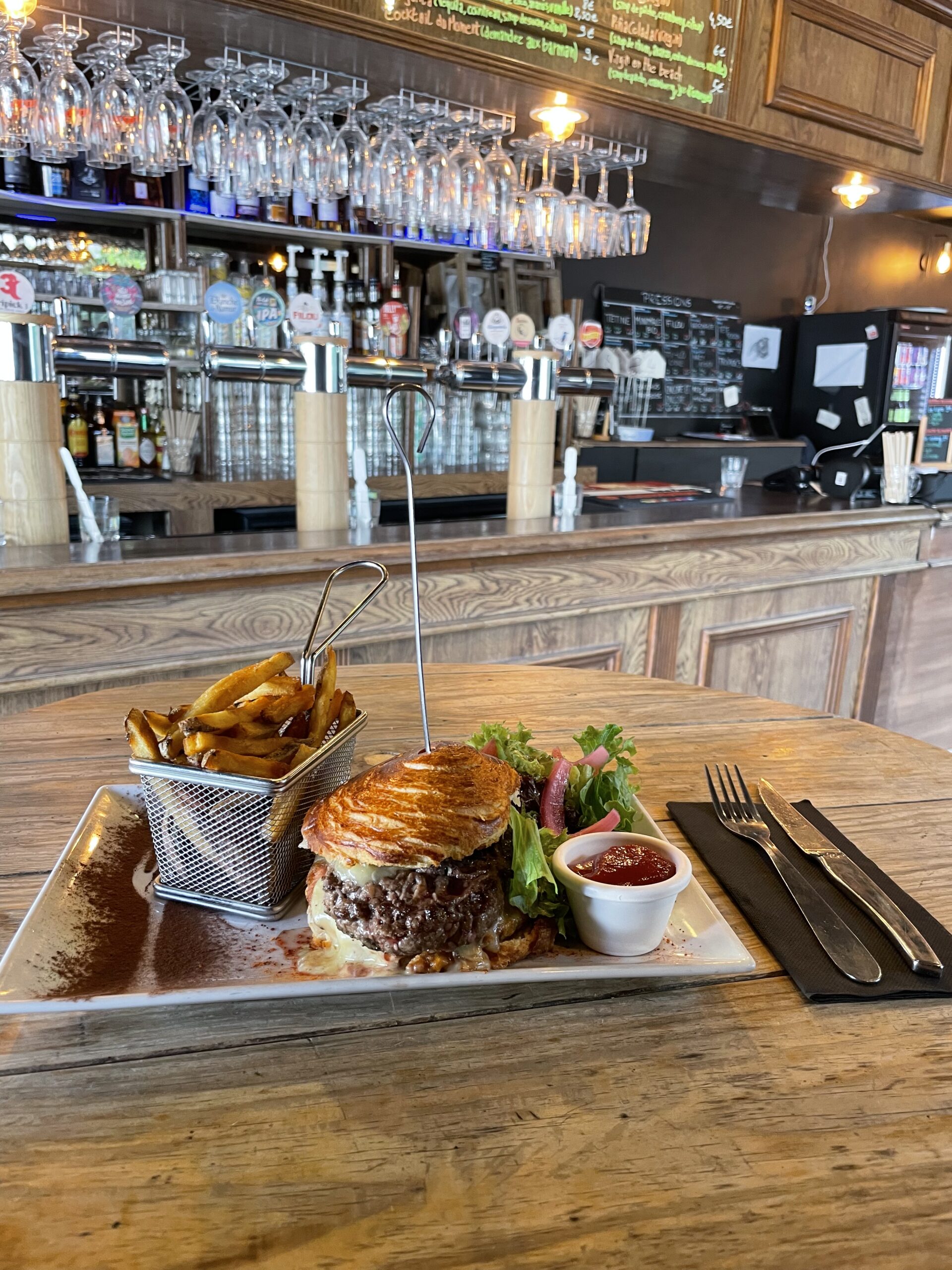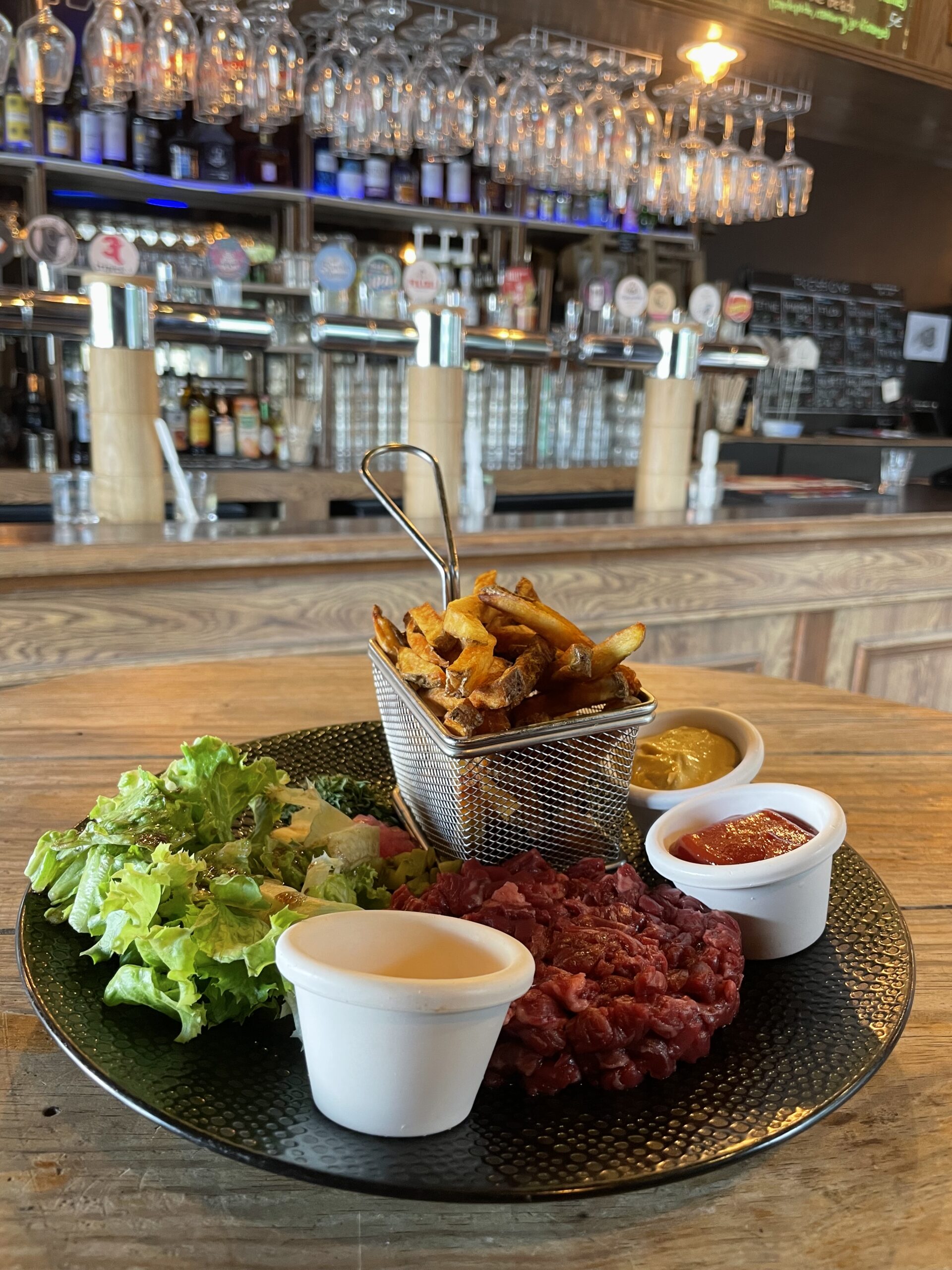 Notre carte Entrées et Desserts du moment A l’ardoise Les Burgers Déclinable en végétarien Classique Bun, Boeuf haché ou steak végé, emmental, tomates, savora, ketchup, cornichons aigre-doux, salade oignons frits.Servi avec frites et salade. 15.00 € Alsacien Pain feuilleté, boeuf haché ou steak végé, munster, salade, oignon caramélisés, galette de pomme de terre. Servi avec frites et salade. 17.00 € Pesto Mozza Bun, tenders de poulet aux corn flakes, sauce pesto maison, tomate, mozzarella. Servi avec frites et salade 11.00 € Les Viandes Carbonnade flamande Boeuf mijoté avec ses oignons, carottes, vinaigre de vin rouge, bière ambrée, cassonade, thym. Servie avec frites et salade 14.00 € Ribs de porc marinés Ribs de porc, huile d’olive, épices tex-mex et jaune d’oeuf, servi avec ses pommes de terres grenailles en persillade et salade 13.00 € Tartare de boeuf Tartare au couteau, servi avec câpres, oignons, cornichons, persil et jaune d’œuf. Frites et salade 16.00 € Hampe de boeuf Sauce roquefort, béarnaise ou poivre, pommes de terre grenailles en persillade et salade 13.00 € Les Salades Déclinable en végétarien César Poulet rôti, croûtons, tomates confites, parmesan, salade et sauce César. Petite 9.00 € Grande 13.00 € Chèvre chaud Toasts de chèvre sur pain de mie, lard émincé, pignons de pin et tomates cerises Petite 10.00 € Grande 14.00 € Le Poisson Fish and chips Poisson frit avec sa sauce tartare, ses frites maison et sa salade 14.00 € Apéros Saucissons Nature Noisettes Beaufort Comté 8.00 € Planches Charcuterie Fromage Végétarienne 14.00 € Big apéro Charcuterie + Fromage + Frites + Camembert rôti 30.00 € Camembert rôti 10.00 € Frites 6.00 € Skip back to main navigation