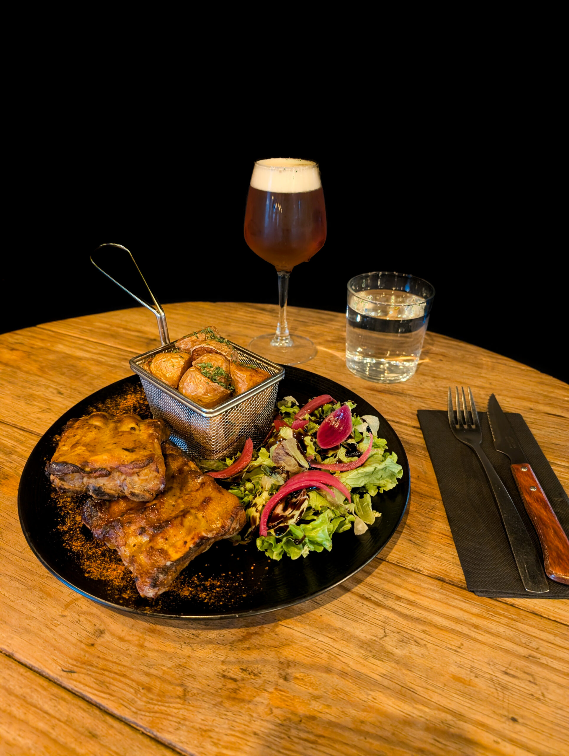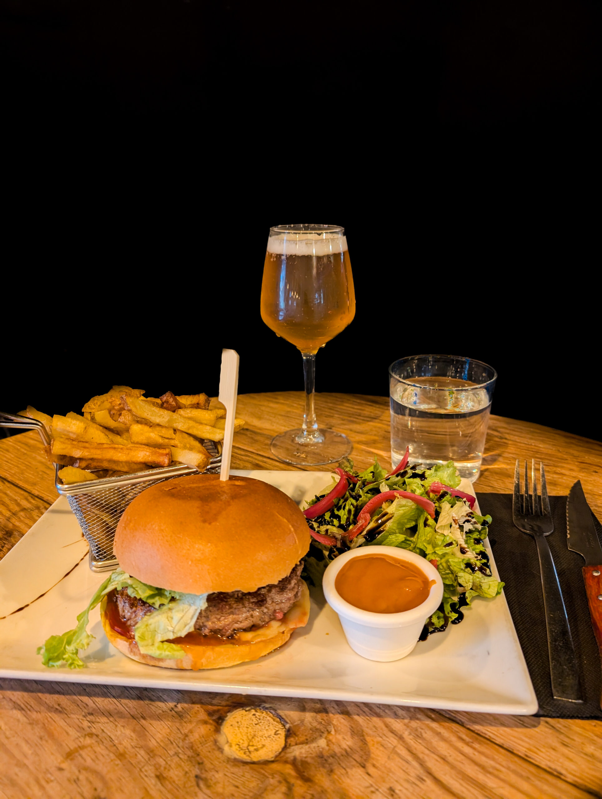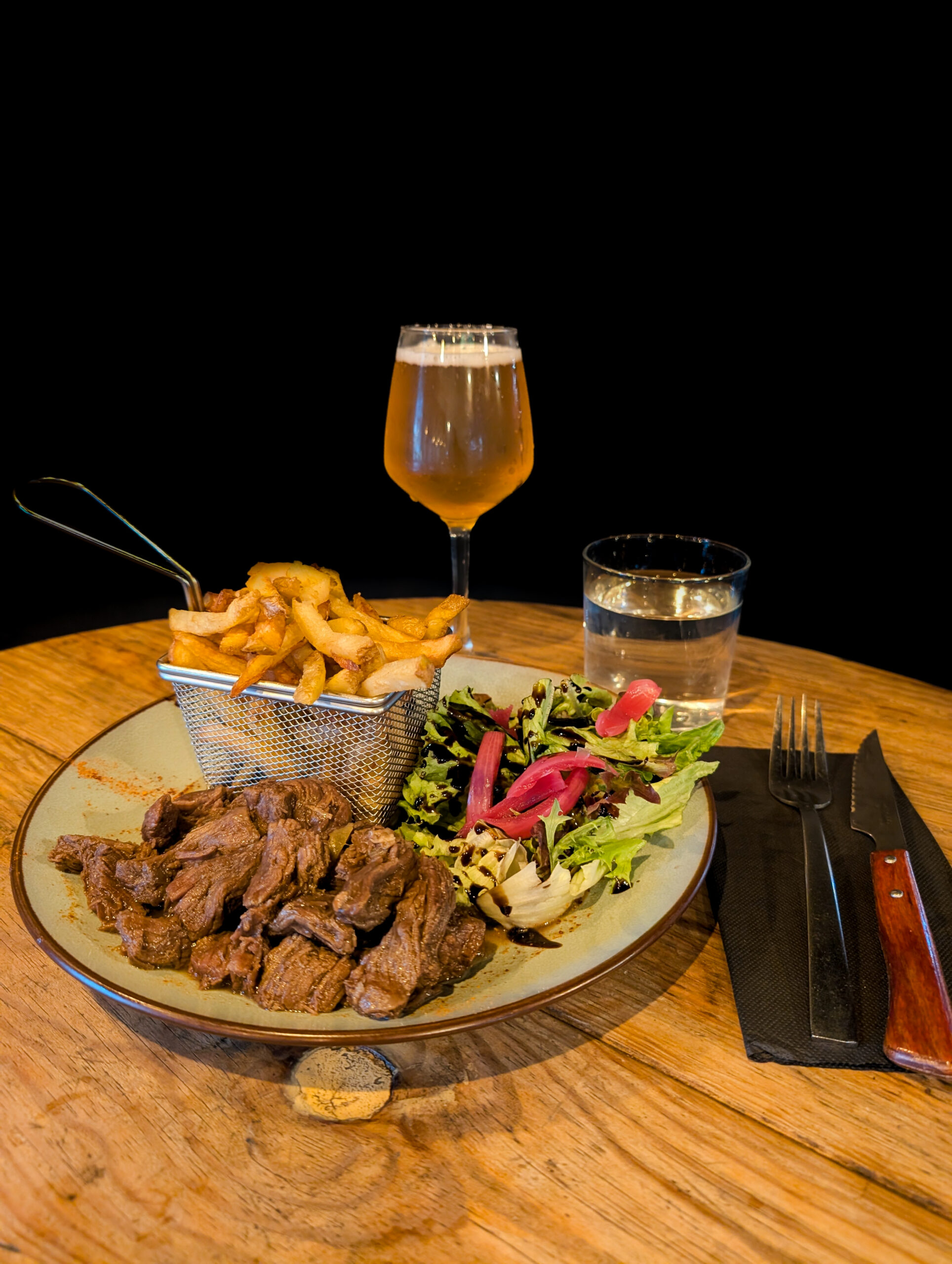 Notre carte Entrées et Desserts du moment A l’ardoise Les Burgers Déclinable en végétarien Classique Bun, Boeuf haché ou steak végé, emmental, tomates, savora, ketchup, cornichons aigre-doux, salade oignons frits.Servi avec frites et salade. 15.00 € Alsacien Pain feuilleté, boeuf haché ou steak végé, munster, salade, oignon caramélisés, galette de pomme de terre. Servi avec frites et salade. 17.00 € Pesto Mozza Bun, tenders de poulet aux corn flakes, sauce pesto maison, tomate, mozzarella. Servi avec frites et salade 11.00 € Les Viandes Carbonnade flamande Boeuf mijoté avec ses oignons, carottes, vinaigre de vin rouge, bière ambrée, cassonade, thym. Servie avec frites et salade 14.00 € Ribs de porc marinés Ribs de porc, huile d’olive, épices tex-mex et jaune d’oeuf, servi avec ses pommes de terres grenailles en persillade et salade 13.00 € Tartare de boeuf Tartare au couteau, servi avec câpres, oignons, cornichons, persil et jaune d’œuf. Frites et salade 16.00 € Hampe de boeuf Sauce roquefort, béarnaise ou poivre, pommes de terre grenailles en persillade et salade 13.00 € Les Salades Déclinable en végétarien César Poulet rôti, croûtons, tomates confites, parmesan, salade et sauce César. Petite 9.00 € Grande 13.00 € Chèvre chaud Toasts de chèvre sur pain de mie, lard émincé, pignons de pin et tomates cerises Petite 10.00 € Grande 14.00 € Le Poisson Fish and chips Poisson frit avec sa sauce tartare, ses frites maison et sa salade 14.00 € Apéros Saucissons Nature Noisettes Beaufort Comté 8.00 € Planches Charcuterie Fromage Végétarienne 14.00 € Big apéro Charcuterie + Fromage + Frites + Camembert rôti 30.00 € Camembert rôti 10.00 € Frites 6.00 € Skip back to main navigation